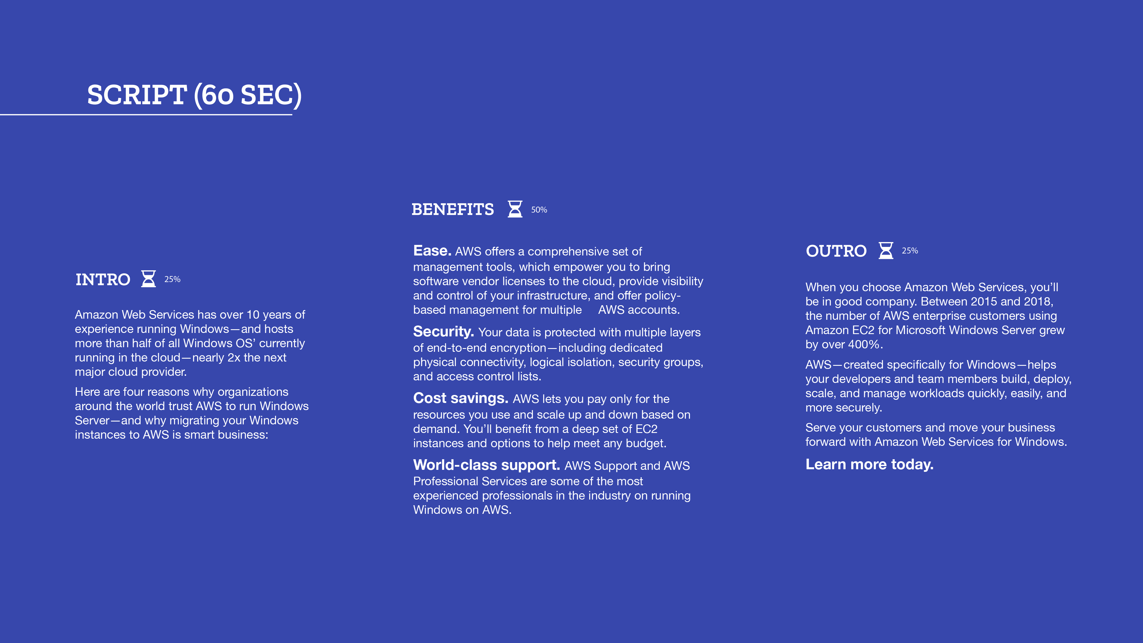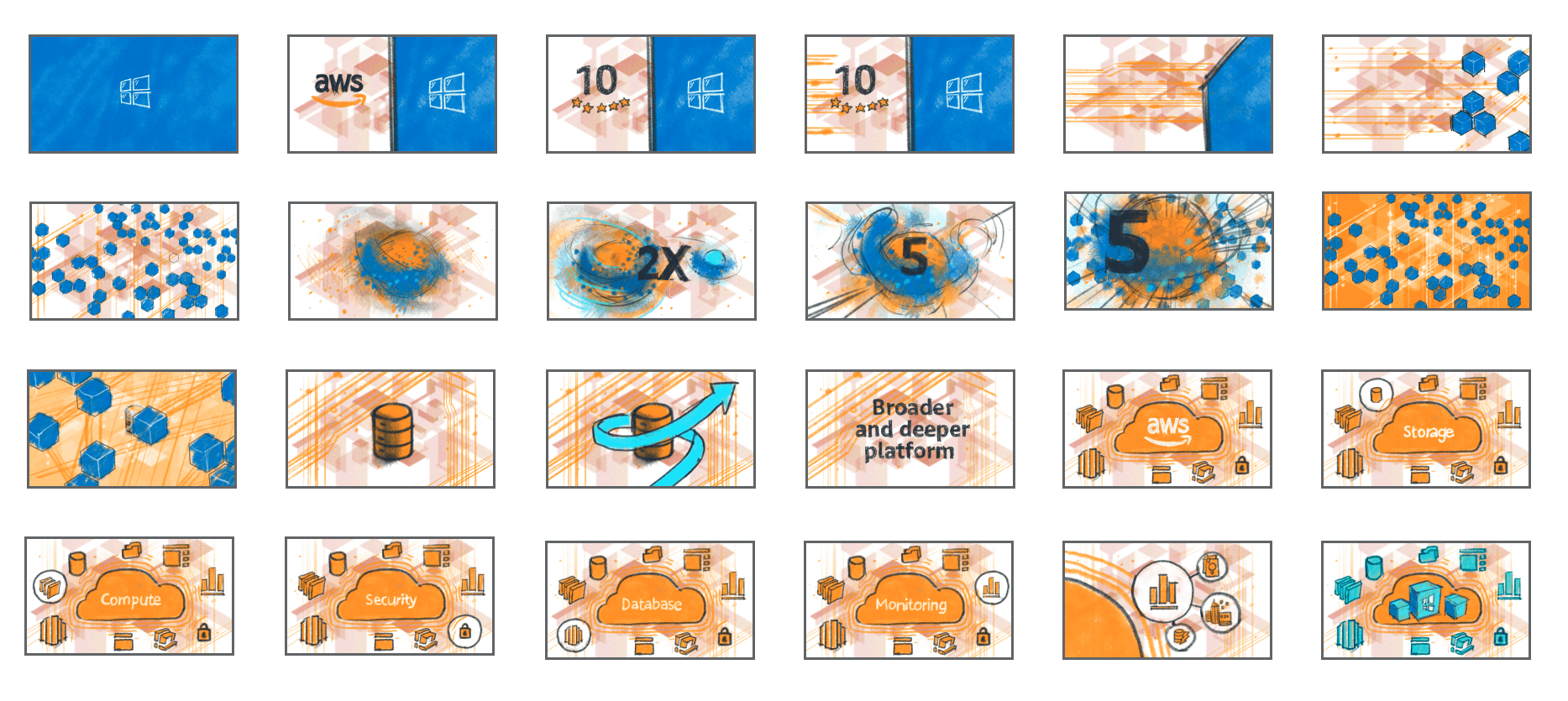 We proposed a dynamic storyboard and short-form video emphasizing four key AWS benefits—ease, security, cost savings, and world-class support—all contextualized within the Windows OS environment. Through ribbon-like visuals and a futuristic progression narrative, the creative showed how seamlessly Windows and AWS integrate. By focusing on relatable Windows features and layering in AWS’s proven infrastructure, the final concept effectively illustrated why migrating Windows instances to AWS is a smart business move.