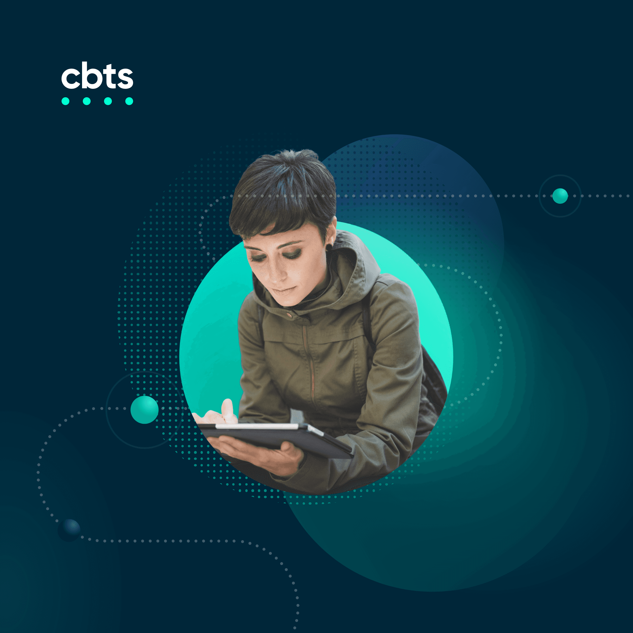 Using the CBTS logo's design, we spotlight their Application, Platform, and Operation (APO) readiness through radiant circles, representing an application era voyage. Dotted lines shape the narrative, encasing key data. The visual portrays top-tier professionals and users seamlessly integrating with apps, encapsulating the swift, data-centric nature of this era, echoing CBTS's pledge: Automation, Optimization, Modernization.