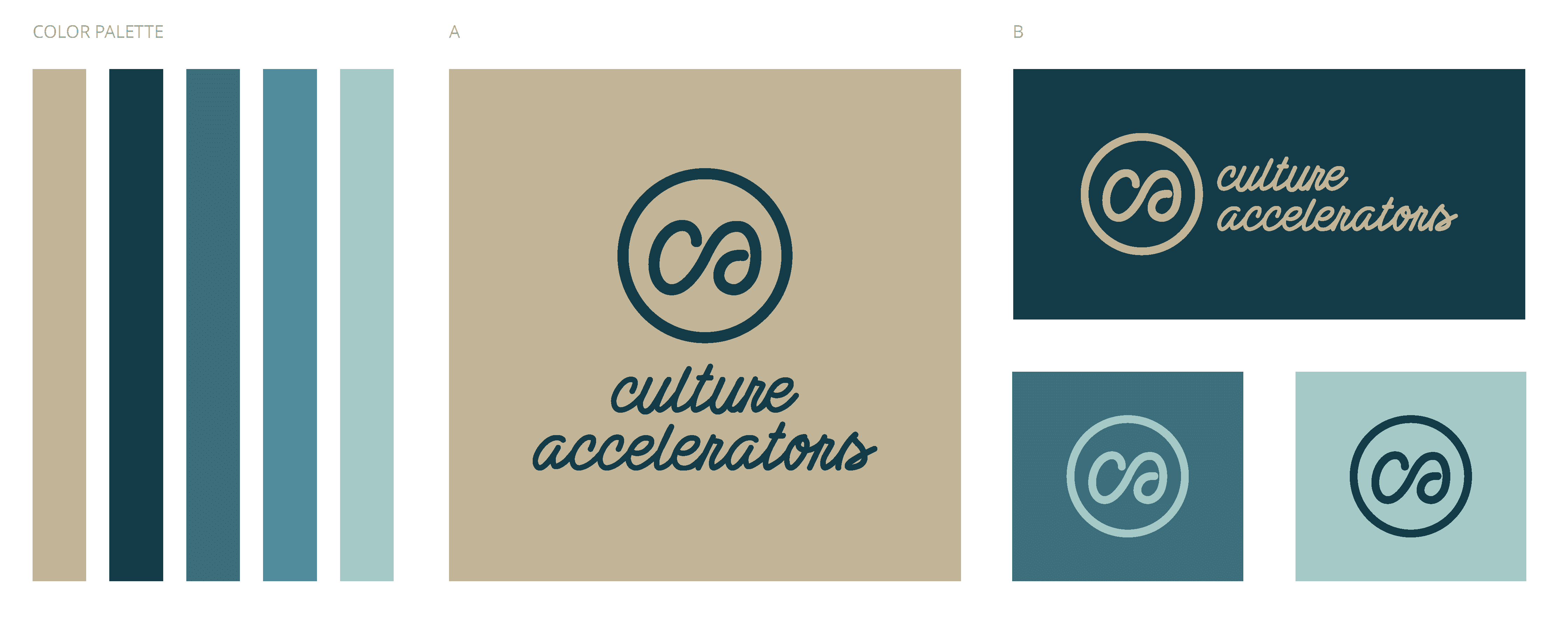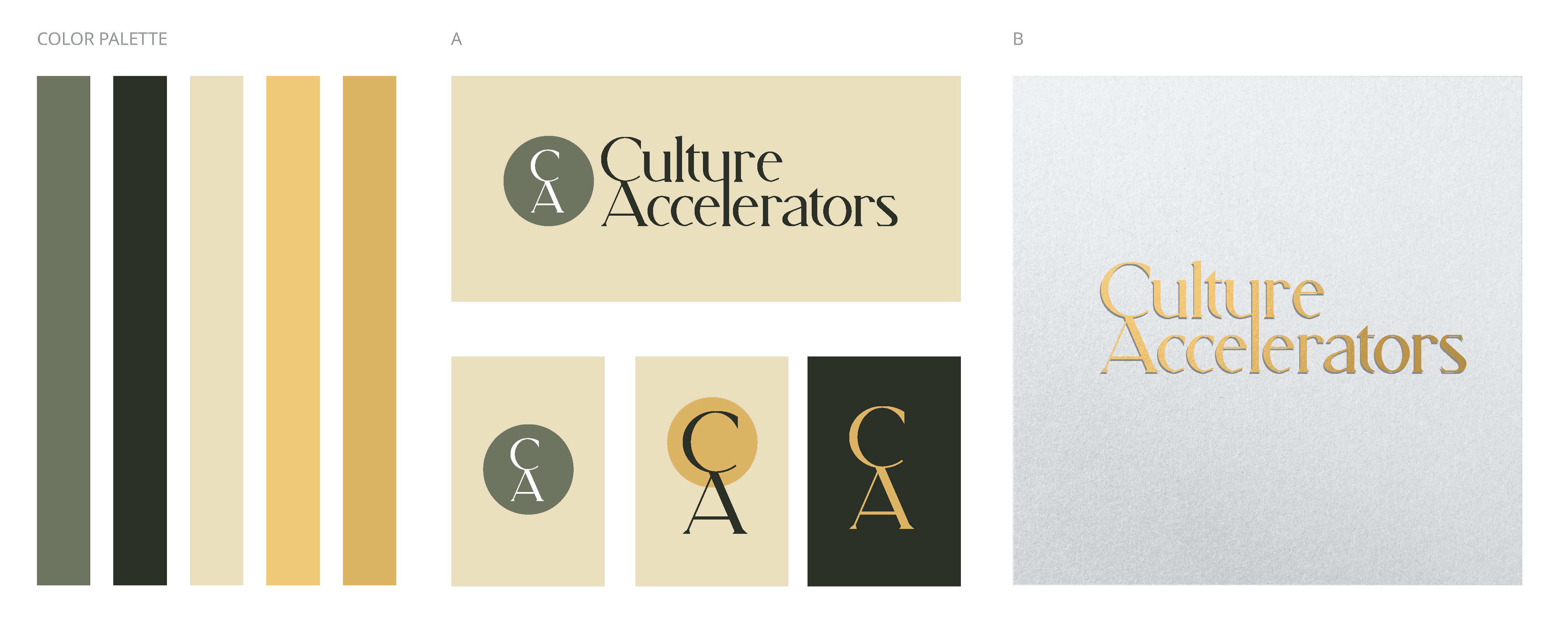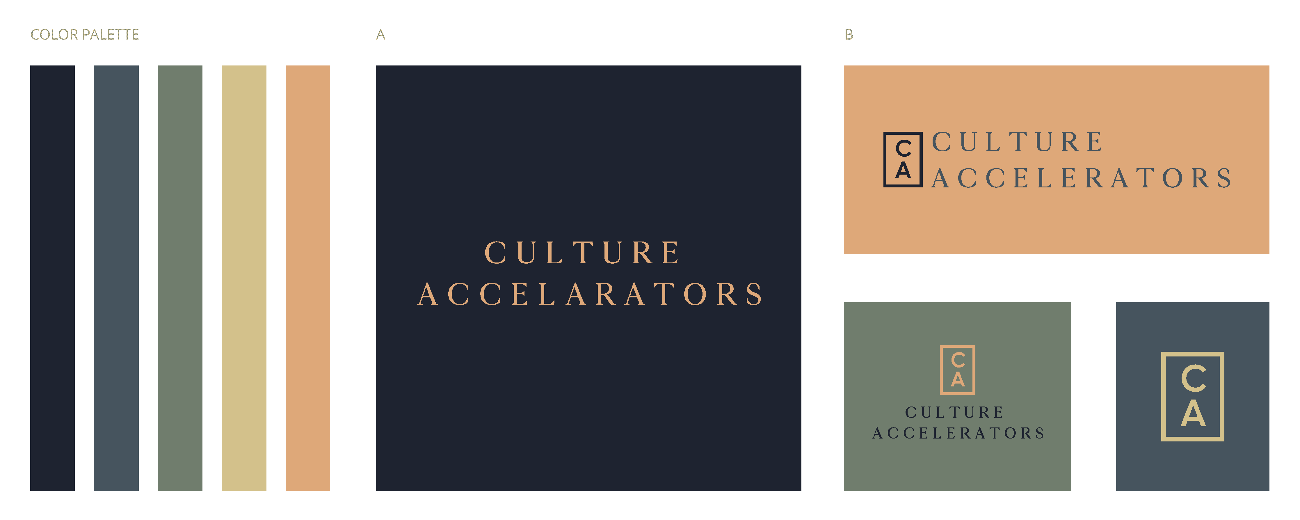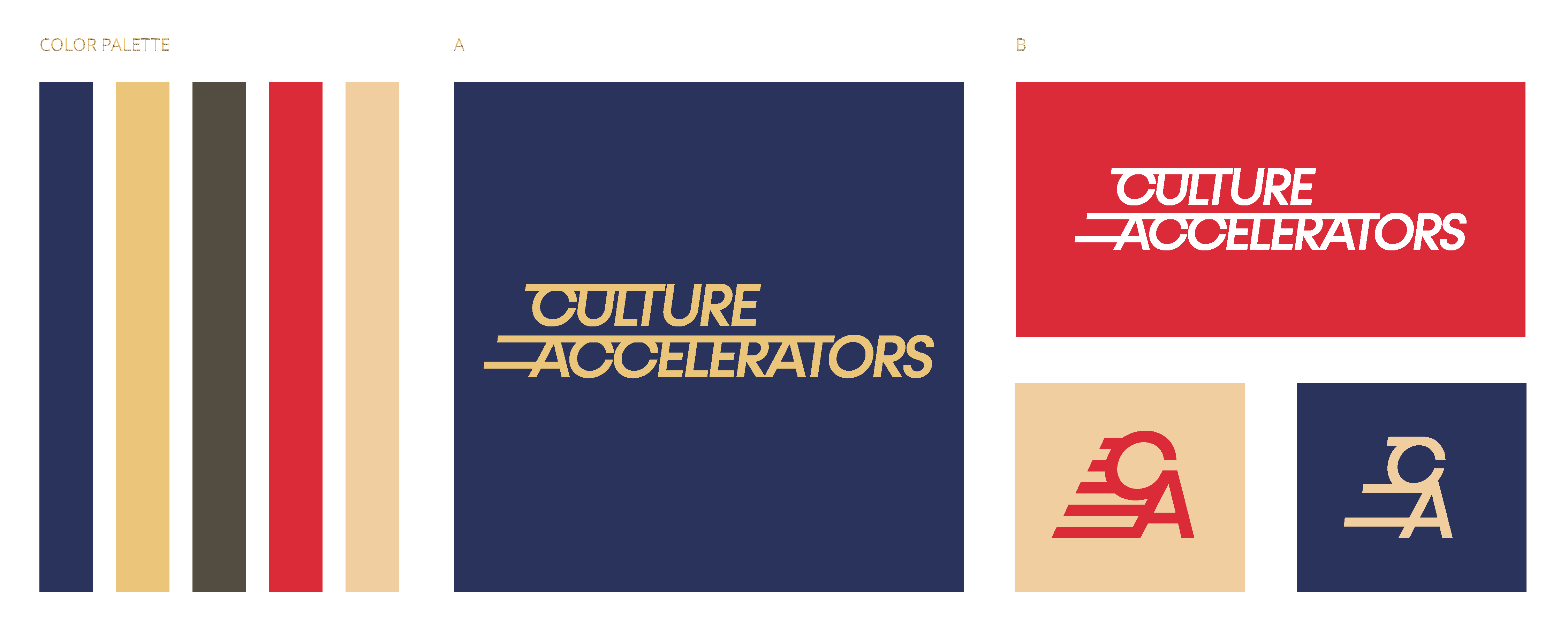 Four logo and color palettes emphasize Culture Accelerators’ progressive, strategic spirit. Each concept uses modern typography, bold visuals, and complementary hues to highlight collaboration and innovation. A versatile “CA” monogram ensures consistent brand presence across platforms. By aligning visual and verbal cues, these designs balance professionalism and approachability—positioning Culture Accelerators as a trusted partner in building thriving workplace cultures.